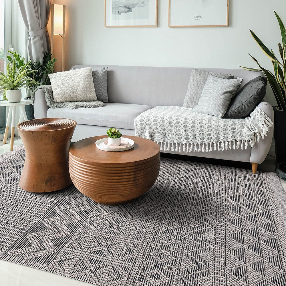 Introducing the Anya Rug 01 Grey Black, the perfect accessory for any room with a bohemian vibe. Handmade from a luxurious wool and cotton blend, this rug features a flat textured pile and decorative fringing that exudes a rustic feel. The intricate handwoven design adds depth and character to any space. Place it in your living room, bedroom,, or any area of your home that needs a cozy touch. The Anya Rug is both beautiful and functional, offering comfort and style in equal measure. Add this rug to your collection today and elevate your decor to the next level
