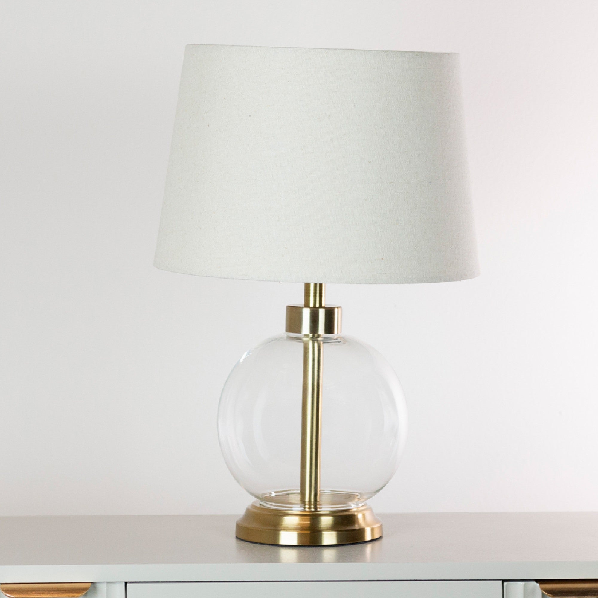This glass and gold table lamp has a sleek shape that goes well with both modern and traditional kinds of decor. The gold details that reflect light make the room feel warm and inviting while also giving a sense of glamour.