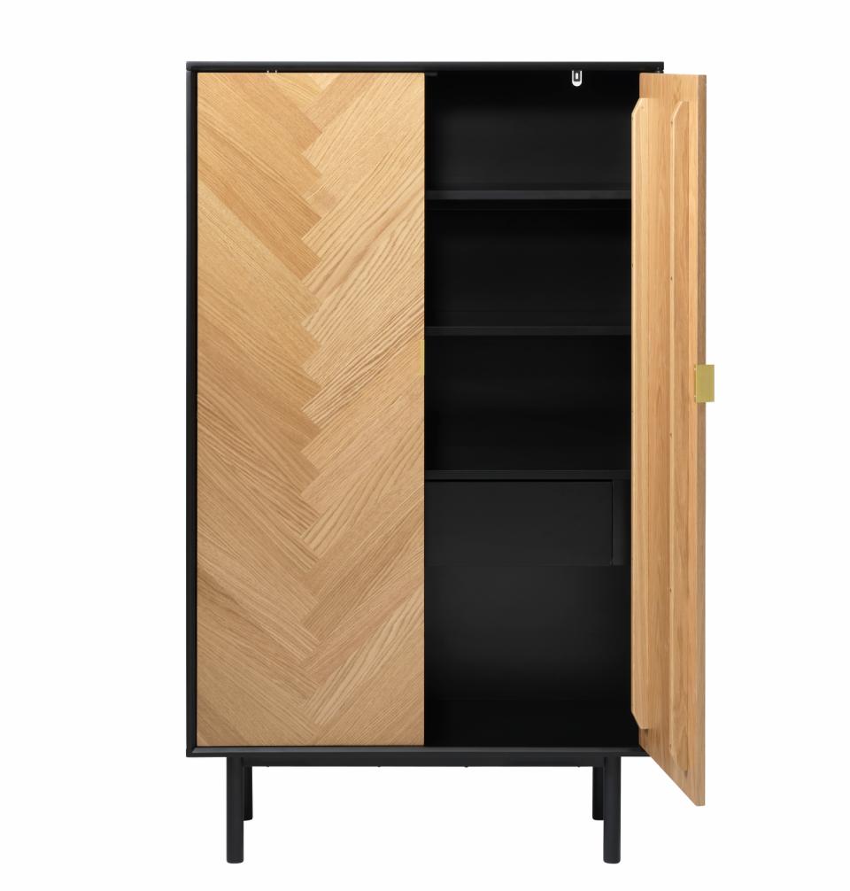 The Calvi Cabinet blends the Scandinavian design lines with a rawer industrial take by combining clean minimalistic lines with the darker aesthetic of exposed industrial metal tubing and the black carcasses of the cabinets. Thus, the striking herringbone feature of the Calvi range results in a unique design focus and an industrial take on a contemporary classic range and will be a daily joy in any home. It offers ample space for dinnerware, books, or personal treasures—without compromising on style. Shopping for cabinets online at Foys allows you to create your own distinctive dining room design.