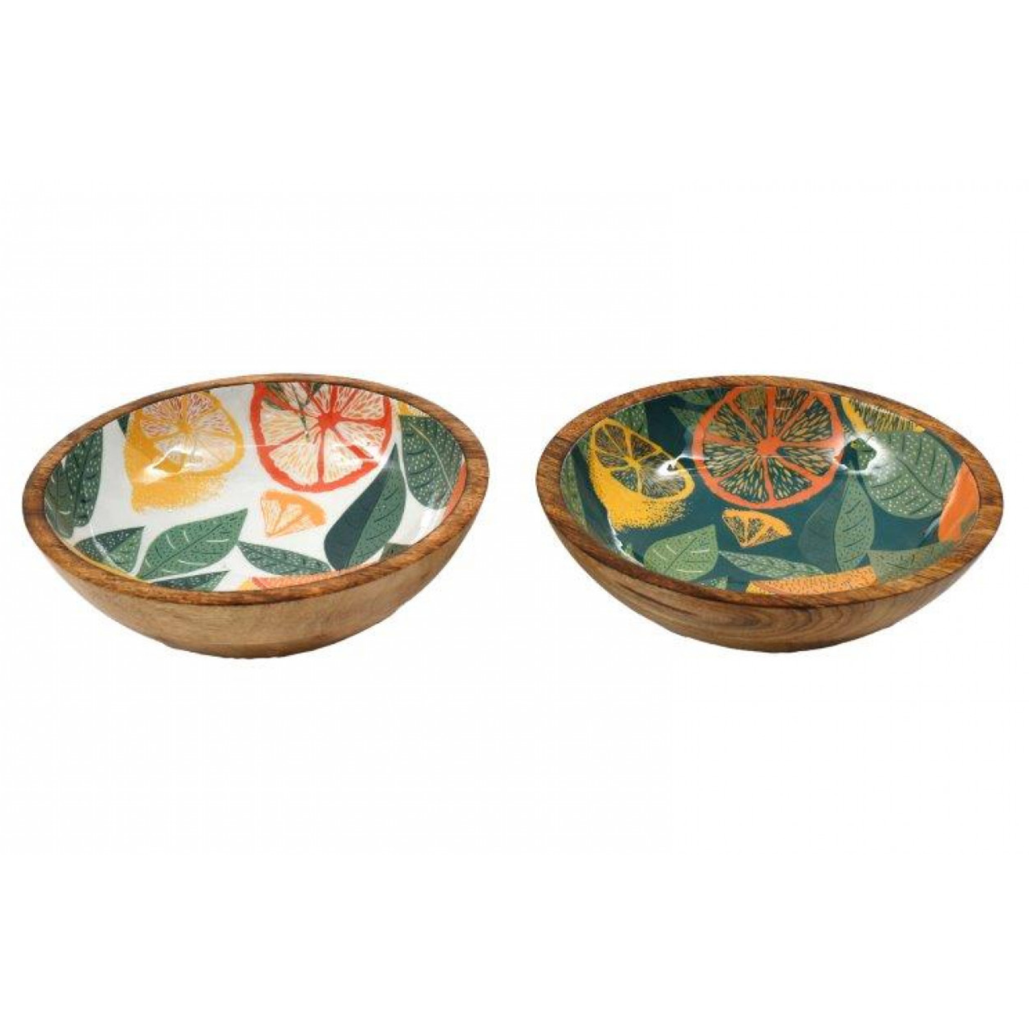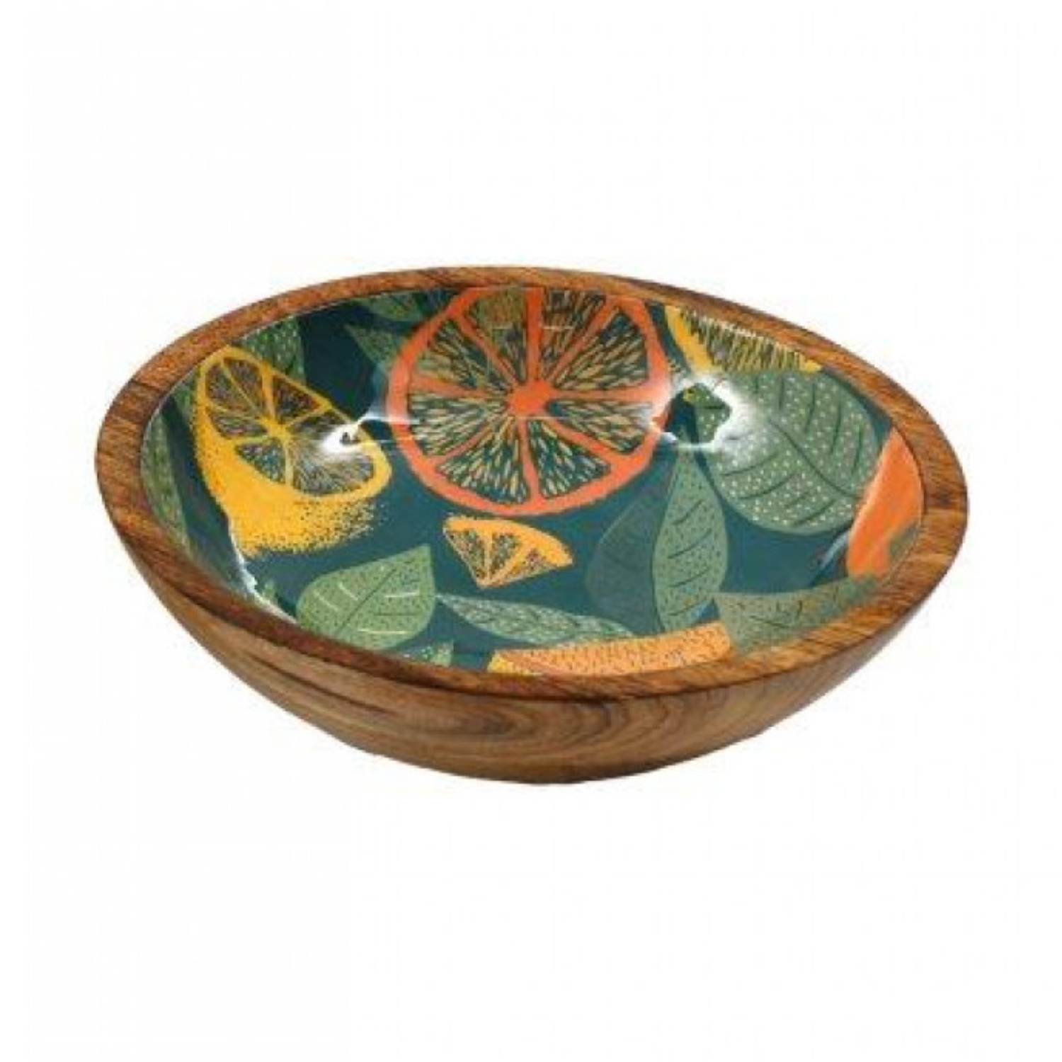 The Delph Collection's large citrus design bowl is a wonderfully made wooden bowl that will add color and personality to your kitchen. This mango wood serving bowl is both stylish and useful. It has a bright citrus enamel interior with fresh lemons and oranges on it. This decorative fruit dish is great for everyday meals and special events. It gives your dining table, kitchen counter, or picnic setting a cheery Mediterranean atmosphere.