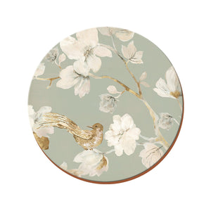 These elegant coasters are adorned with the vintage-inspired Duck Egg Floral design. In this pattern a little bird with golden-flecked feathers perches on soft white tree blossom, painted on a backdrop of beautiful duck egg blue.
