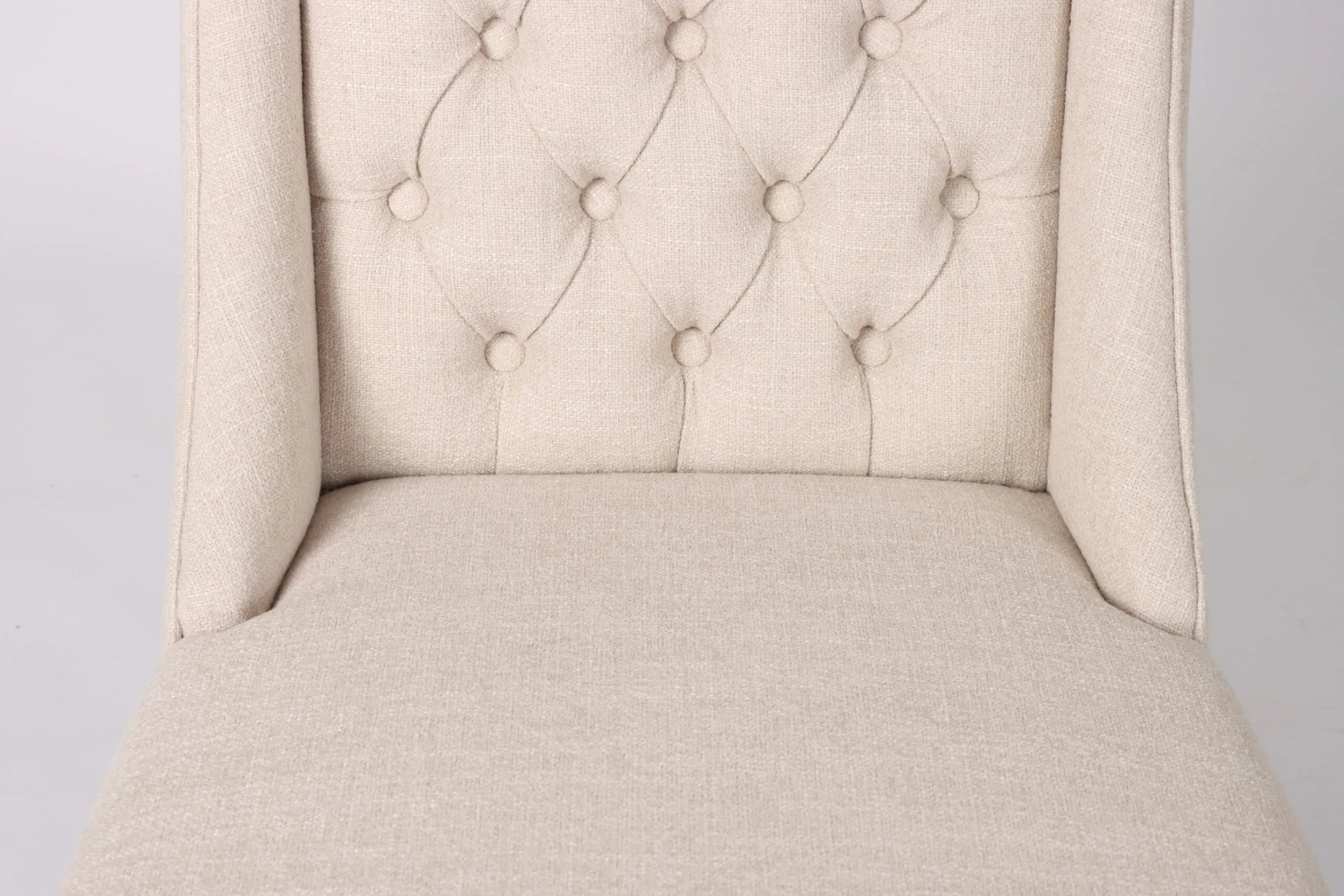 - Elegant beige fabric upholstery with decorative button detailing