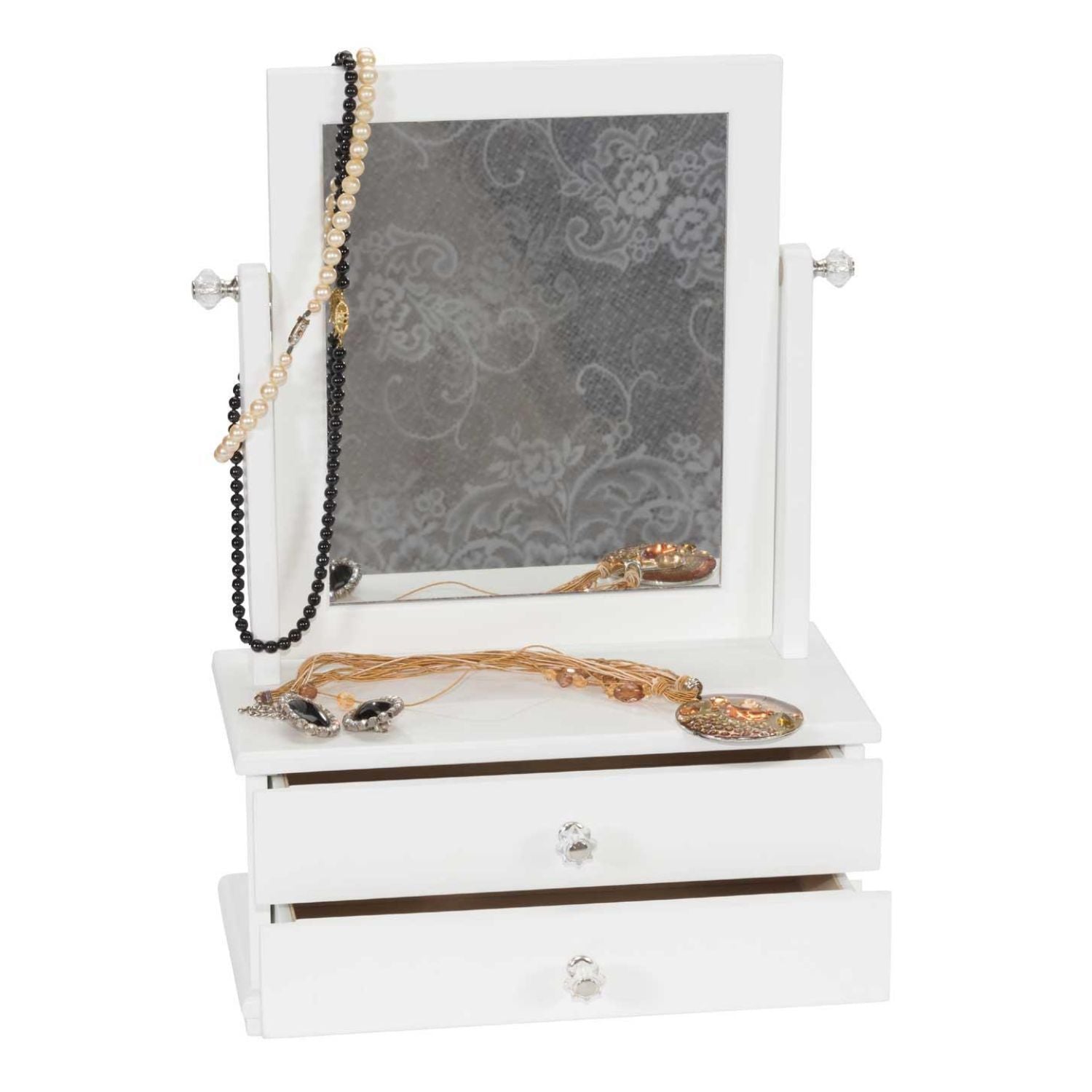 Introducing the Faith Mirror Jewel Case, the perfect combination of style and practicality. Expertly crafted with a white painted finish, this mirror jewel case will be sure to turn heads and make a statement in any home. It includes a swivel mirror complete with crystal effect necklace hangers for easy access to your most beloved jewelry items. Furthermore, this mirrored jewel case also boasts two drawers for easy storage of other precious pieces. With its crystal effect handles, every time you open up the Faith Mirror Jewel Case you’ll be able to enjoy both luxury and convenience.