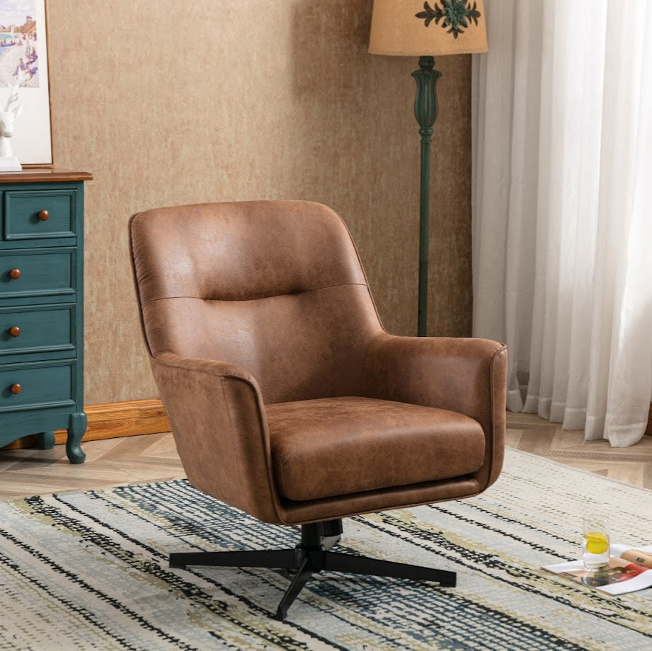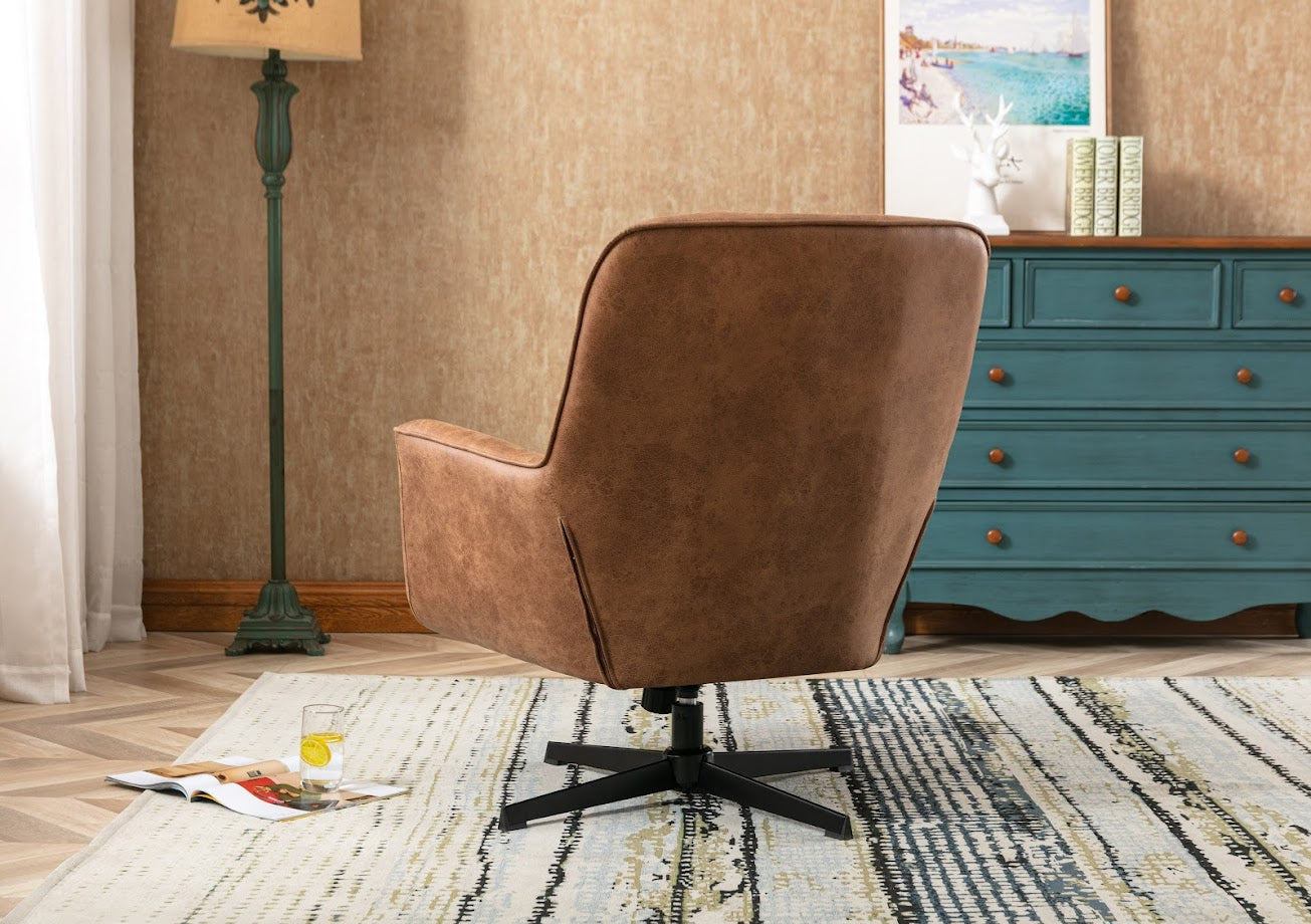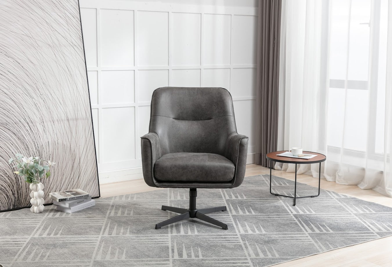Immerse yourself in elegant relaxation with the Felicia Swivel Accent Chair designed to elevate your living space. Experience the versatility of the swivel feature, allowing you to effortlessly rotate to suit your surroundings for 360˚. The neutral tan and charcoal tones of the leather feel fabric complement any interior styles, ensuring that this chair becomes a timeless focal point in any space. Durable black metal base offers stability and long lasting for years to go. Easy to clean with a damp cloth its it perfect for busy houses. Shop accent chairs online at Foys and blend luxurious comfort with a practical swivel feature that lets you pivot with ease.