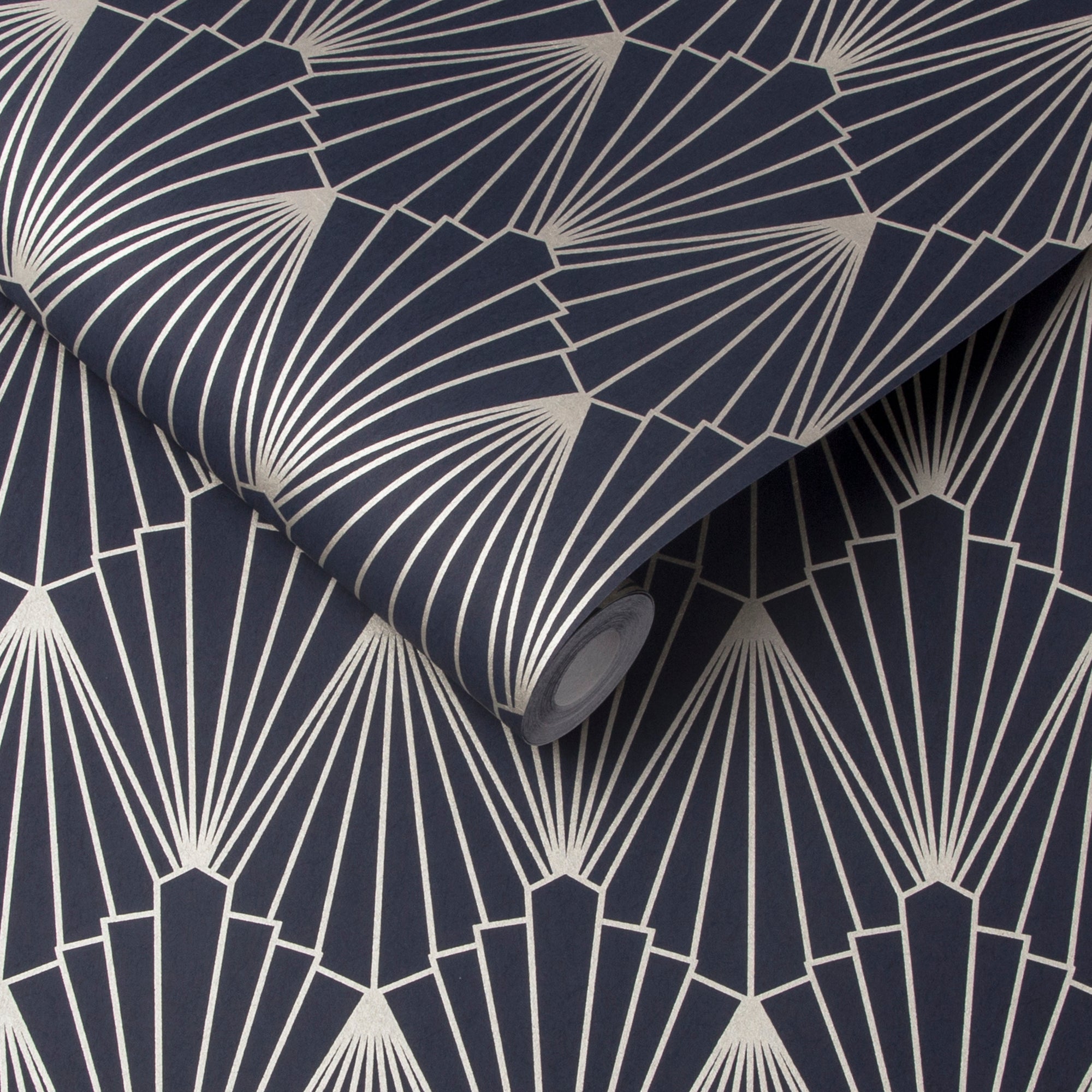 Upgrade your walls with this shining and sophistication Graham & Brown Rene Nightfall Wallpaper that will brings a depth and a modern touch to your living space. Inspired by Gatsby parties and architectural structure, with repetitive fans detailed in silver metallic, resplendent on textured navy paper. Rene Nightfall wallpaper will bring opulence and sophistication to your decor. High-quality material ensures a longevity and easy application. Shop wallpapers online at Foys to add warmth and sophistication to your home decor.