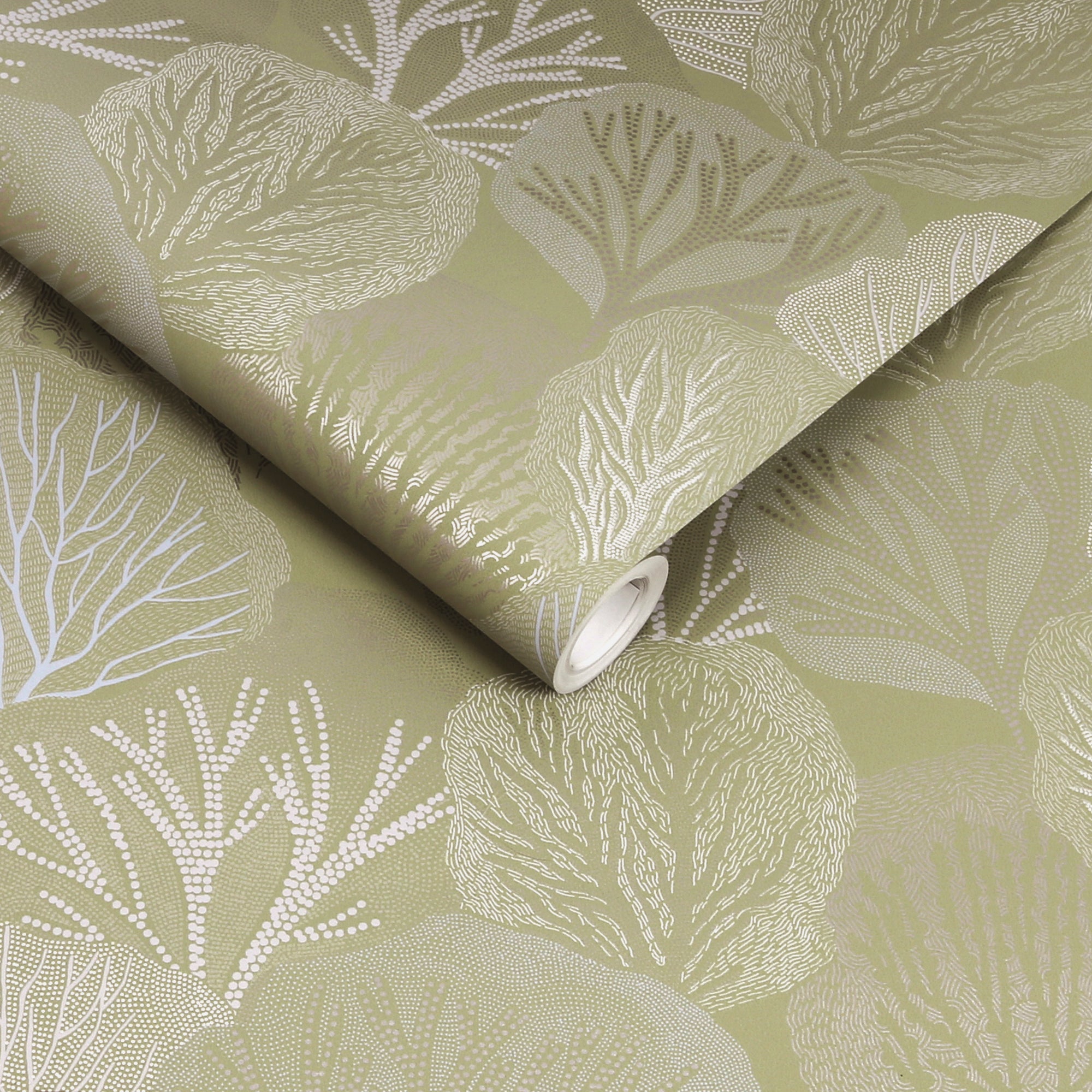 Upgrade your interiors with this premium quality Graham & Brown Twyla Sage Wallpaper that is laden with metallic elements. Inspired by coral reefs the tree like structures build across the trees design. This tonal Sage colorway pairs perfectly with our 2024 Color of the Year Viridis with cooler pale gold metallic. To application you need just past the wall and hang up wallpaper on. Whether use it for single wall or for whole room delicate metallic details reflect light beautifully, creating a calming atmosphere. Shop wallpapers online at Foys to add warmth and sophistication to your home decor.