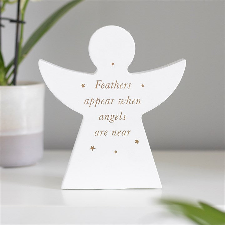 - Features sweet angel silhouettes with meaningful gold metallic phrases.