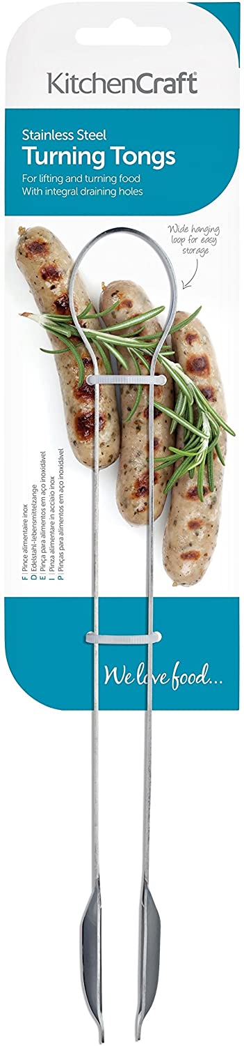 All purpose stainless steel food tongs for serving or turning over food whilst cooking, these food tongs feature draining holes in the plates for removal of grease, fat or liquid when serving.