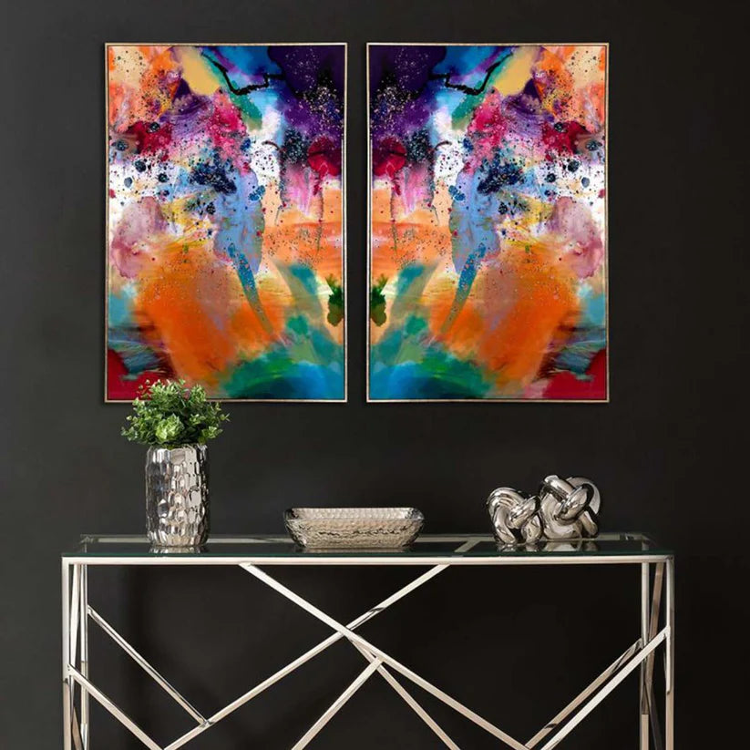 - Bold, multicoloured abstract wall art with dynamic paint splatters