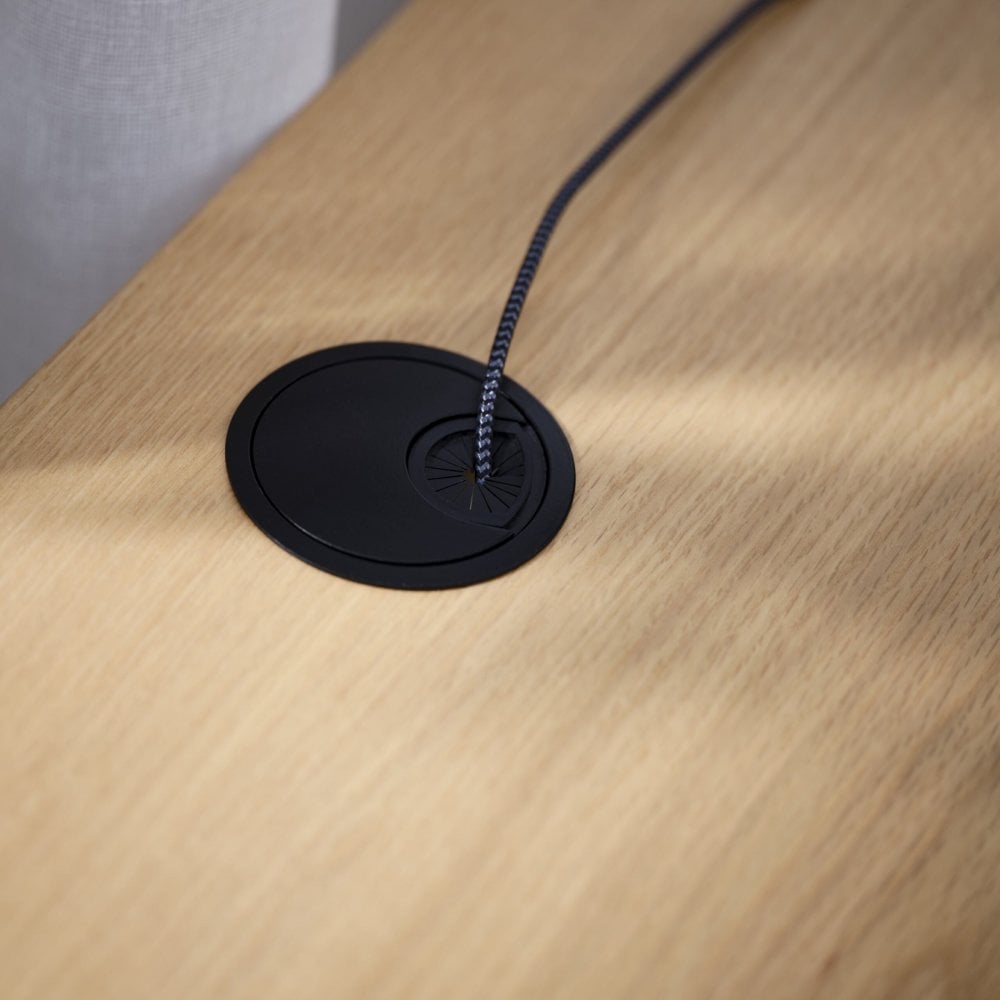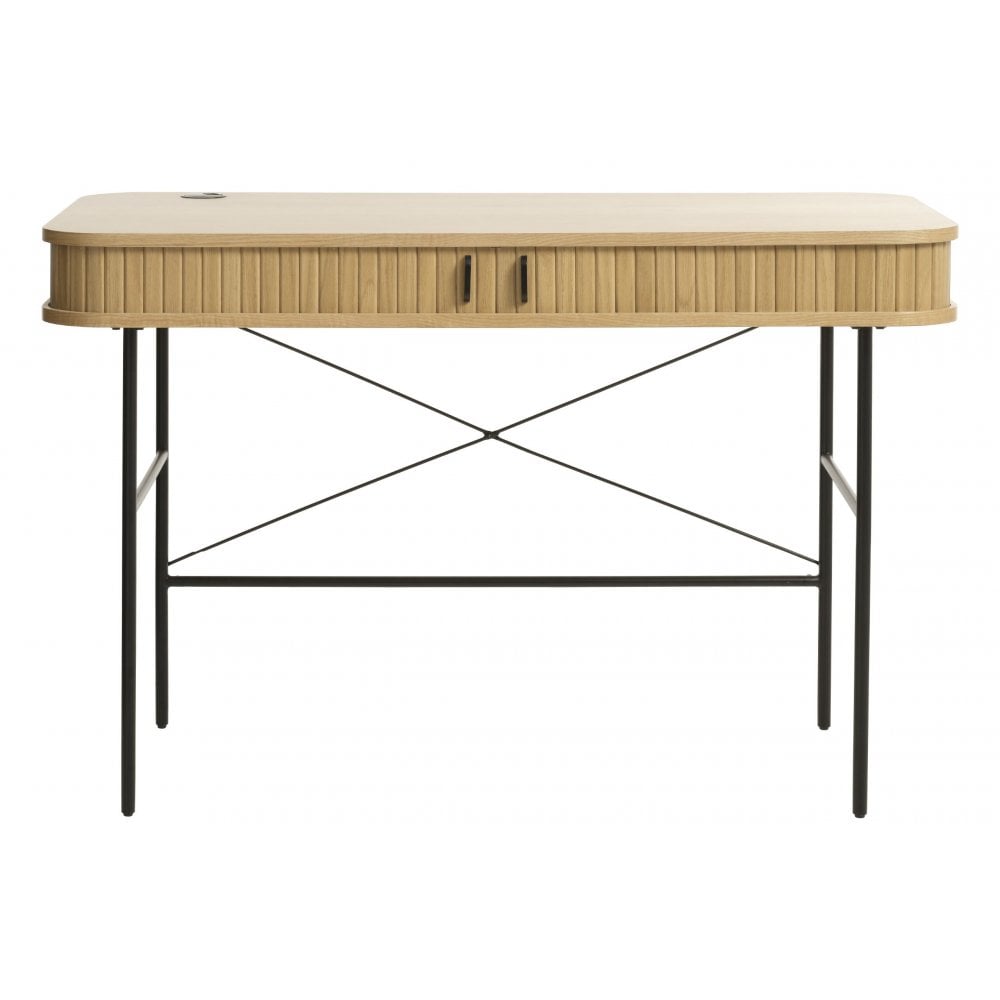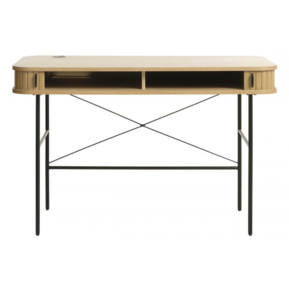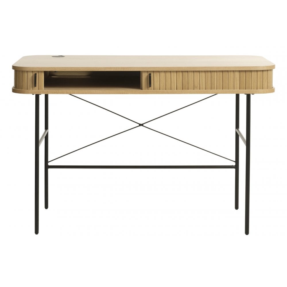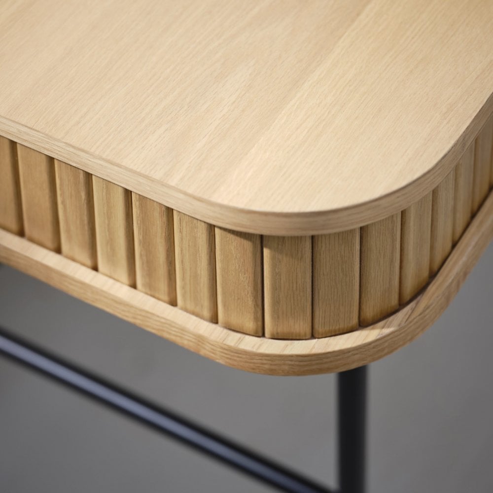 Introducing the Nola Desk in Natural Oak, a versatile piece of furniture that seamlessly combines the functionality of a desk with the elegant design. Crafted with oak veneers and accented with industrial touches of black metal and organic soft corners, the table brings a light and airy touch to your living room. The space-saving slatted sliding doors open all the way around, providing easy access to utilize the interior space to its fullest potential. Organize your belongings and create a stylish workspace with this exceptional console desk. Shop desks online at Foy and Company and elevate your living room with the Nola Console Desk.