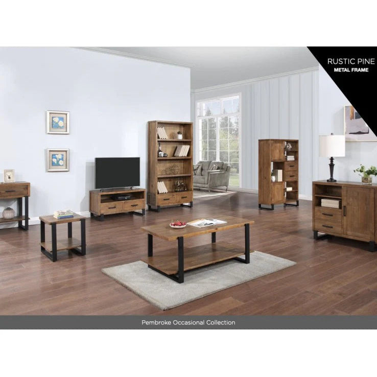The Pembroke Coffee Table with Shelf is a well-made wooden coffee table that will make your living room furniture look better. This coffee table for living rooms has a rustic pine finish with sleek black accents. It combines classic style with modern usefulness.