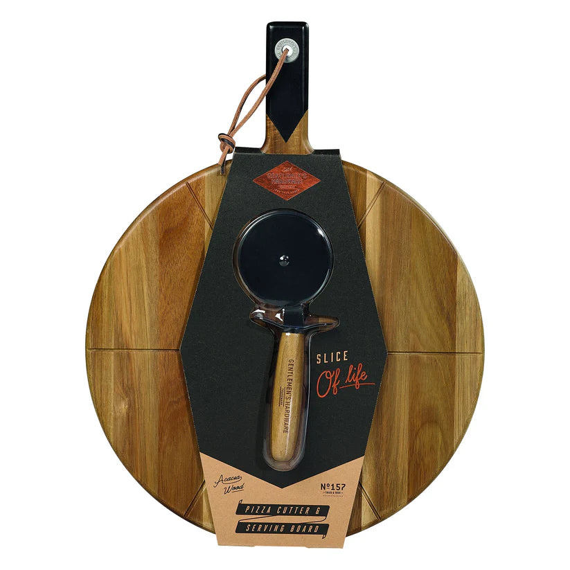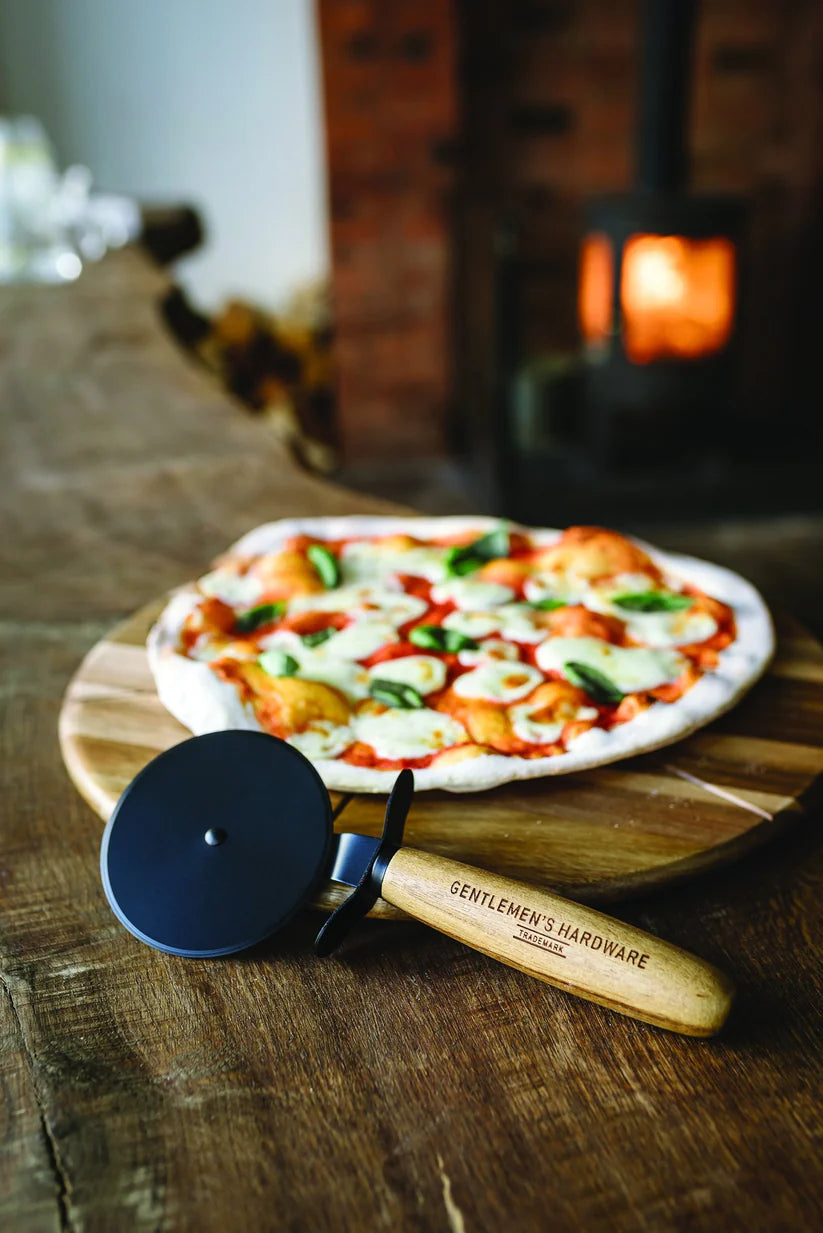 Enhance your pizza nights with our Pizza Cutter And Serving Board set. Crafted from premium acacia wood, this 15” board provides ample space for six slices, accompanied by a coated steel pizza cutter featuring a branded wooden handle. For added convenience, the board features leather hook ties for easy storage. Discover our Collection and shop online at Foy And Company.
