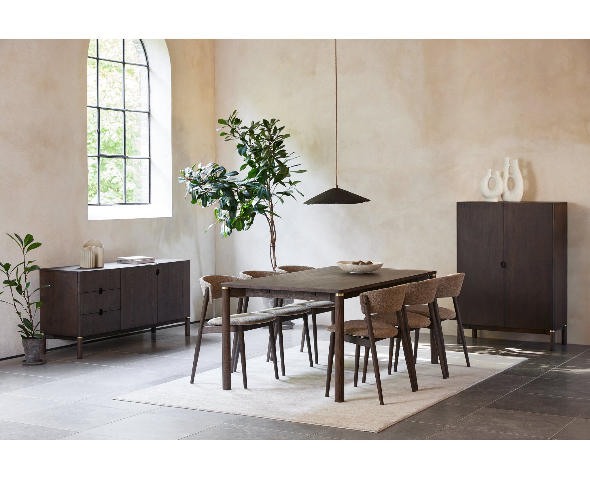 The Revere Dining Chair combines stylish design with comfort and high-quality materials. With its refined Latte Melange fabric featuring an irregular panama weave and sturdy espresso oiled wood frame, this chair exudes timeless elegance that fits perfectly in both modern and classic interiors. Whether it's for a cozy meal with friends or a formal setting, this fabric dining chair adds a touch of luxury to any dining room. The interplay of yarns and diverse weft and warp colors bestows a timeless, refined aesthetic. Chenille yarns within the weft create a velvety pile, enhancing the fabric's softness. Reinforced with a subtle undercoating for added durability. Shop dining chairs online at Foys and redefine your dining room furniture collection with style and comfort.