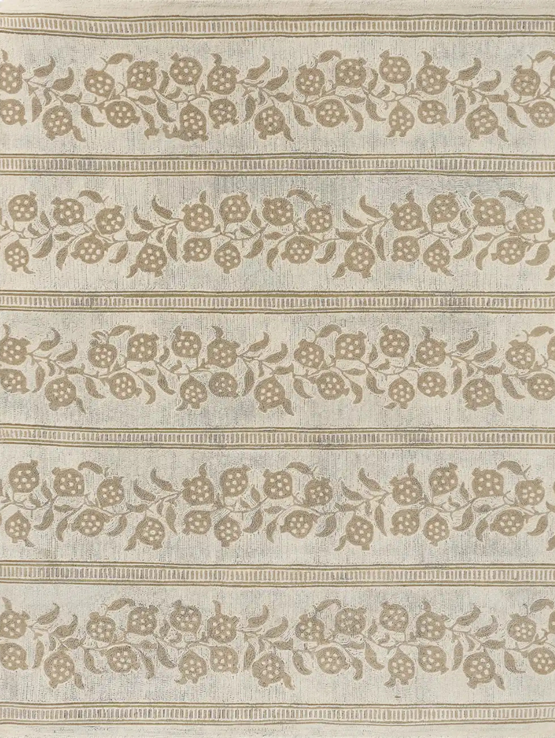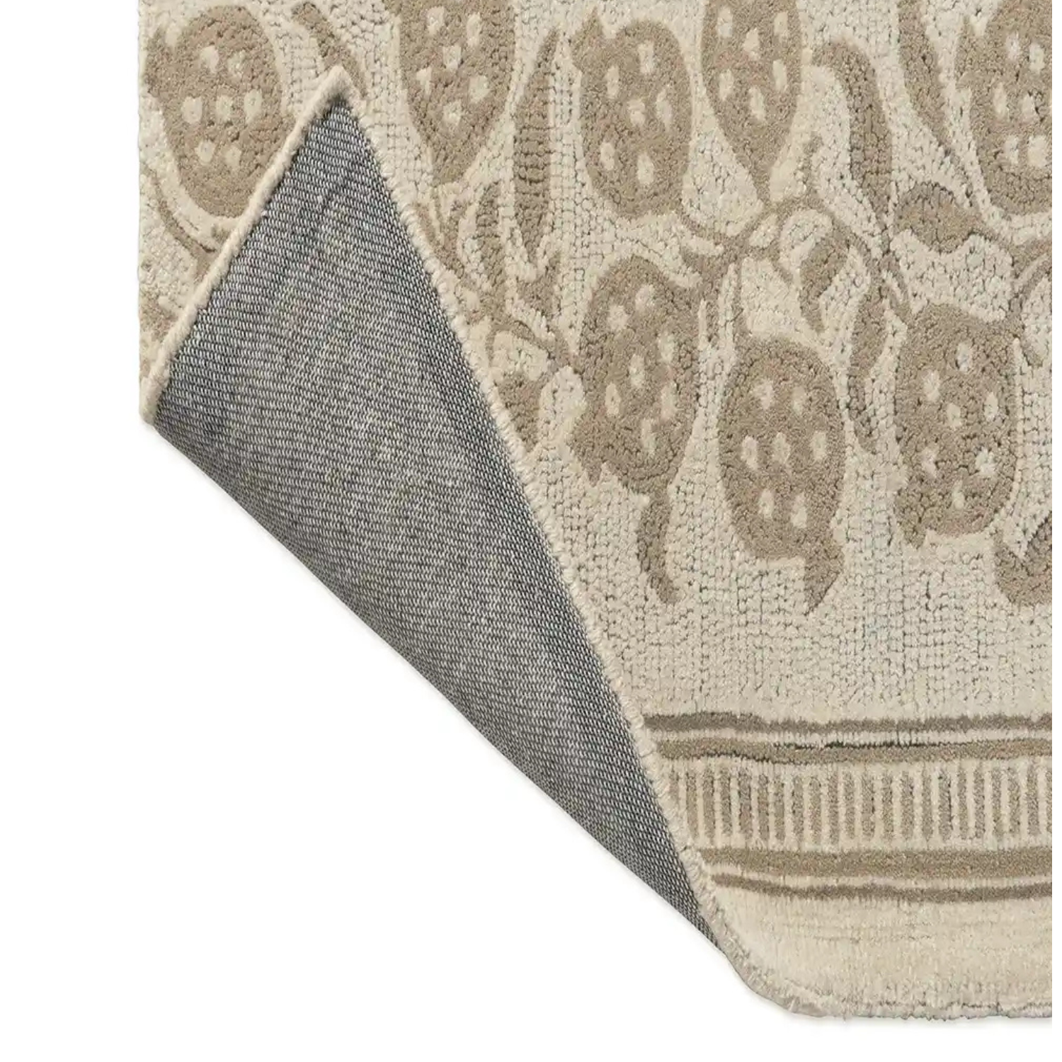 With a soft, natural take on the famous Anaar pattern—a sign of life and growth—the Sanderson Anaar Flax Rug honors the beauty of nature. Hand-tufted from brand-new wool, this floral rug is a perfect mix of style, comfort, and skill. It is perfect for living room, bedrooms, or formal dining rooms because its soft brown and flax tones make the room feel calm and go with both modern and traditional decor.