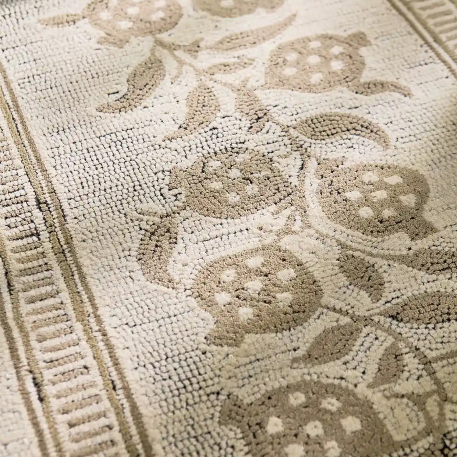 The stylized pomegranate and leaf pattern is a unique mix of geometry and nature, making it great for people who want an artistic flower rug.