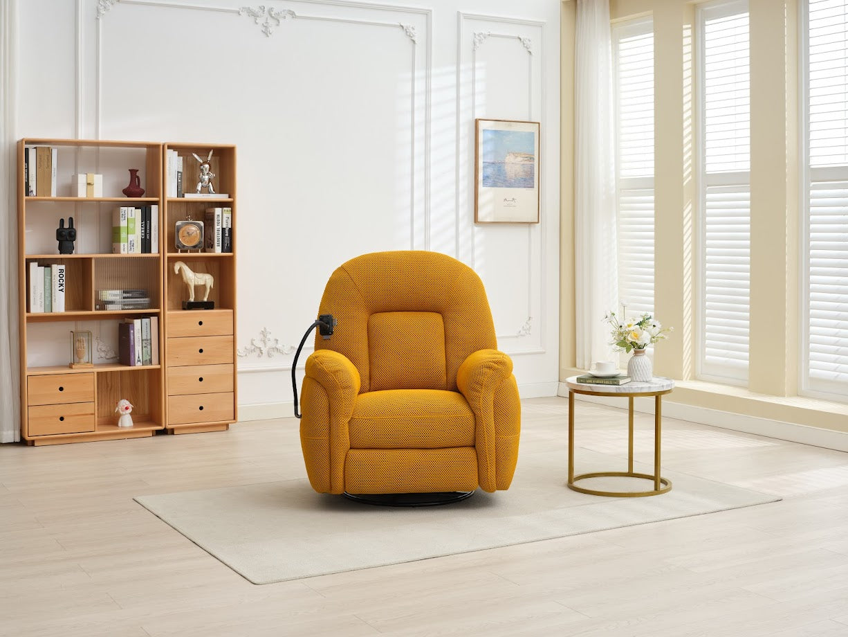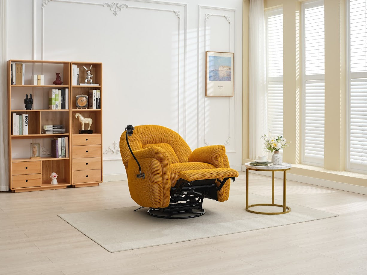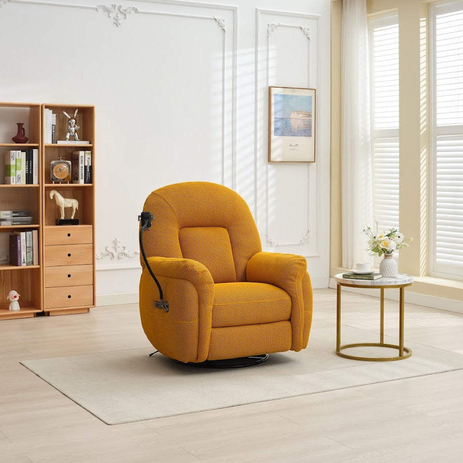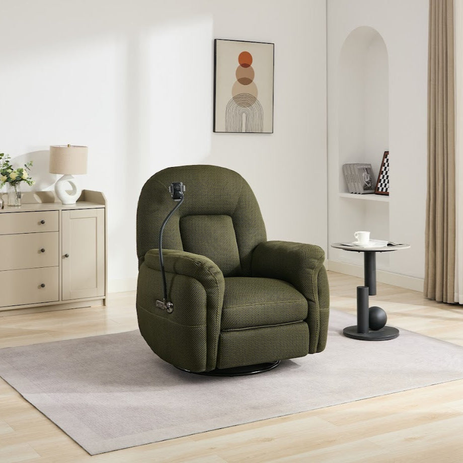 The Sienna Electric Recliner Armchair with built phone holder designed in modern style for phone lovers. Upholstered in soft perforated fabric with super soft cushioning and armrests this armchair will sink you into relaxation and let the world melt away. Reclining armchair with button function blending classic and modern design with luxurious comfort. Featured USB-C ports on the power panel will you’re your devices charged during you’re watching your favourite videos. With adjustable phone holder you needn’t to hold your phone in your hands anymore. Perfect for any living space, combining timeless elegance with the convenience of adjustable reclining positions. Shop armchairs online at Foys and elevate your downtime while complementing a wide range of interiors with timeless charm. Available in mustard, green and grey colors.