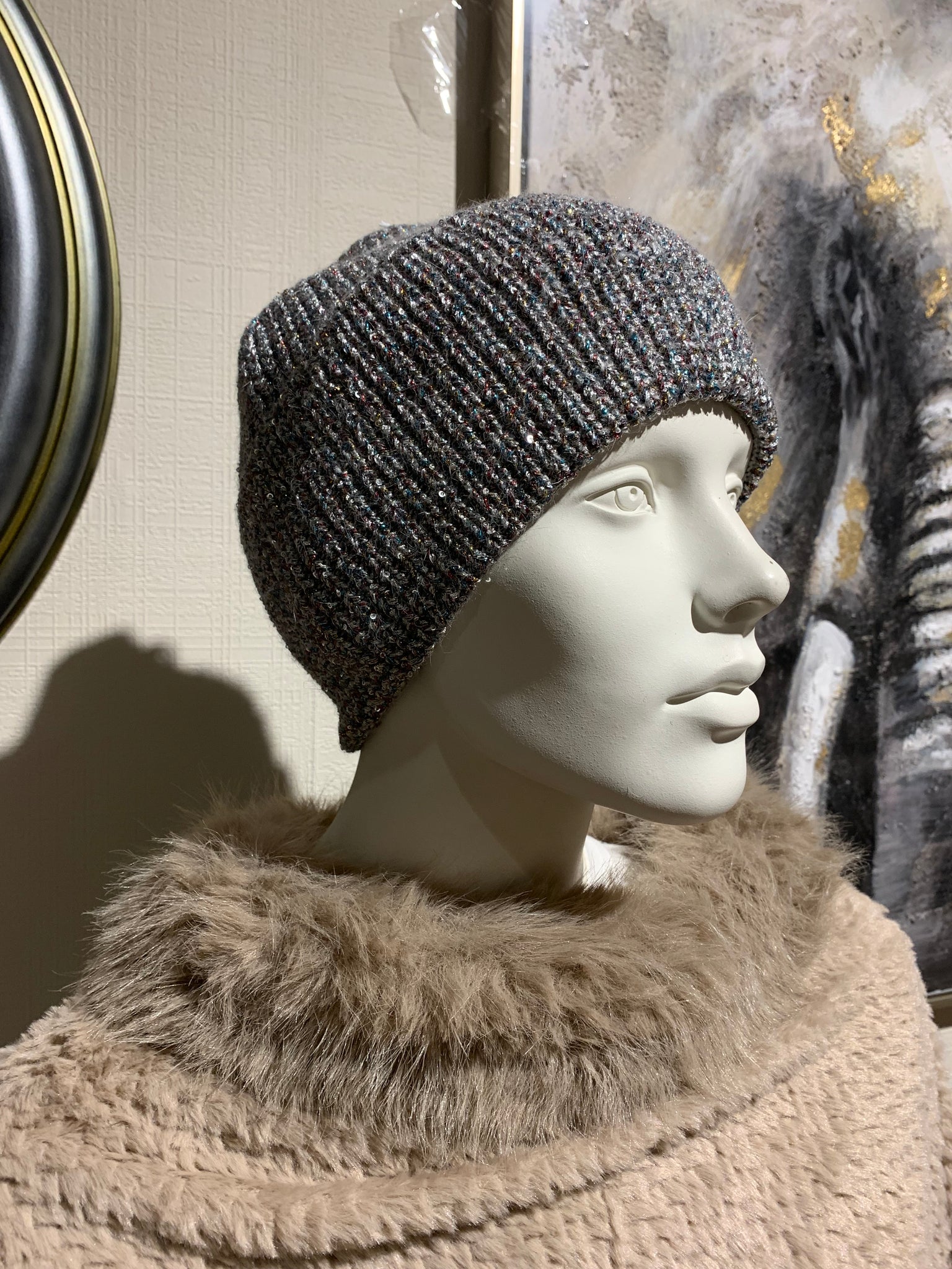 Sparkling Grey Knitted Hat – Warm Winter Hat with Sequins