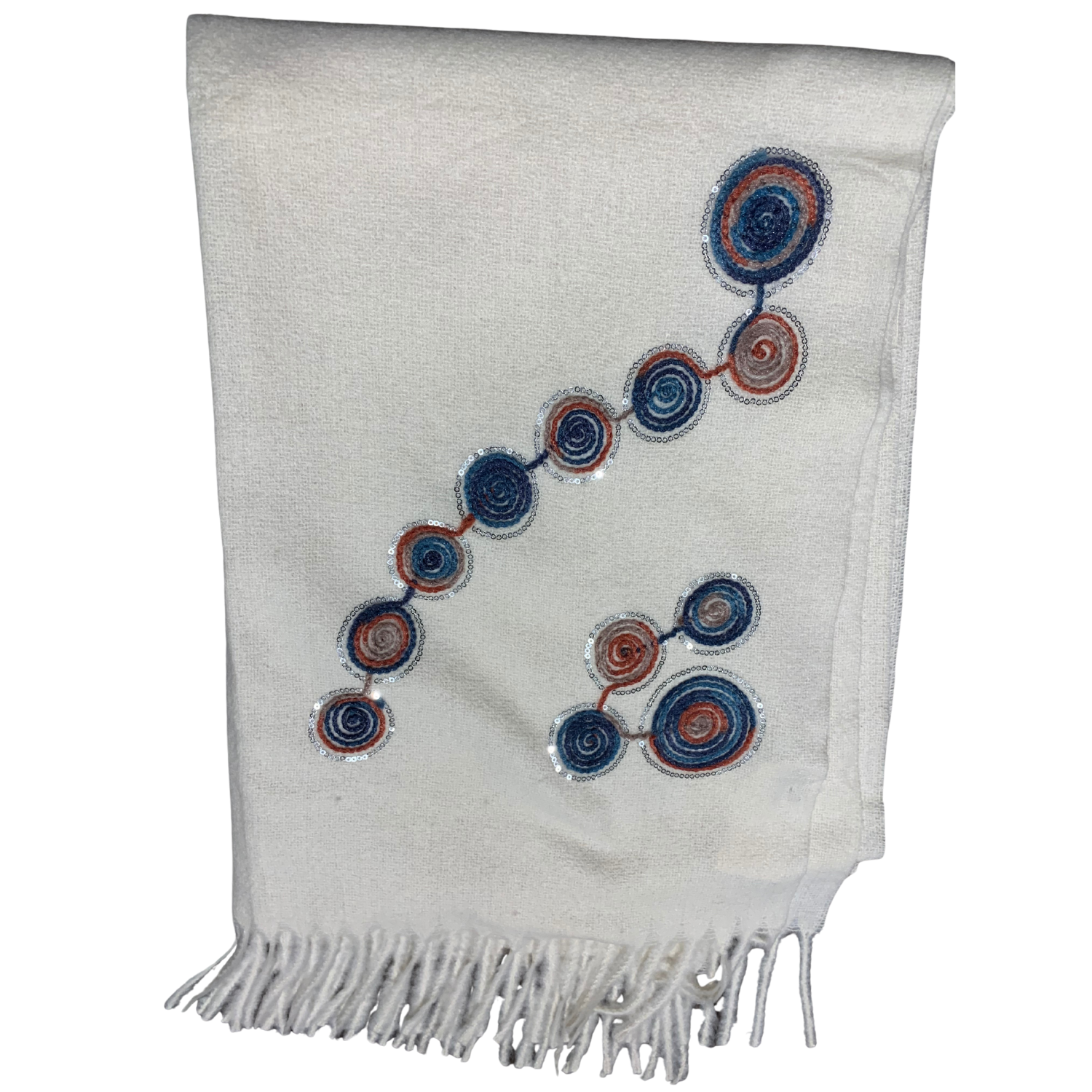 Our white embroidered scarf is the perfect mix of beauty and comfort. This scarf is made of very soft fabric and has exquisite fringe borders. The embroidery in blue, orange, and silver makes it sparkle. This accessory is great for any season and may be used as a gift for her or to dress up your everyday clothes.